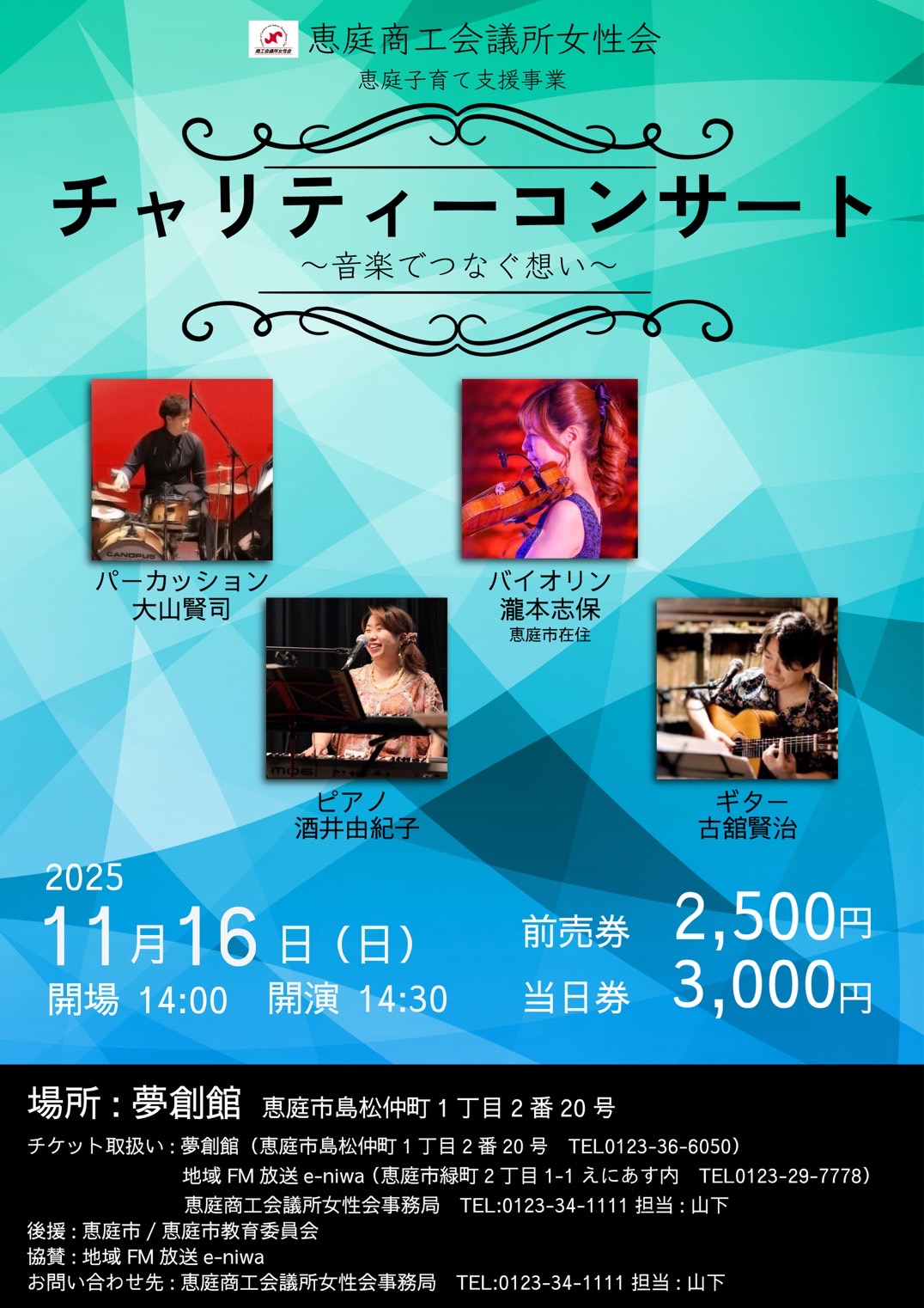 なお、本コンサートの収益金は「えにわ・花子さん愛情寄附」の一環である子育て支援事業への寄付に活用させていただきます。