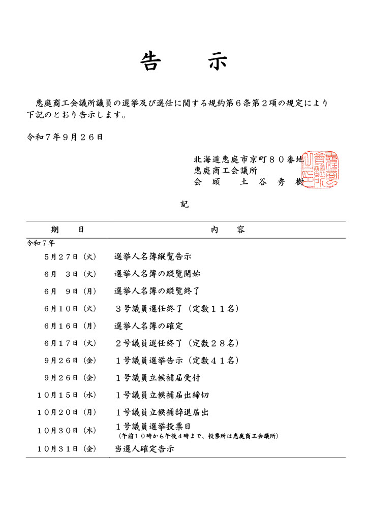 表題の件につきまして、恵庭商工会議所議員の選挙及び選任に関する規約第6条第2項の規定により、下記のとおり告示いたします。